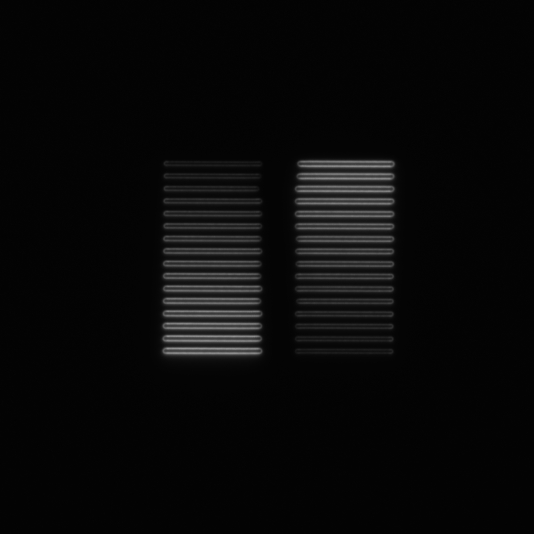 圖案D – 2×16強度。此圖案由兩個16個22.5μm×1.5μm矩形組成,這些矩形在線性演化后具有不同的熒光強度水平,并以2×16矩陣形式組織排列。