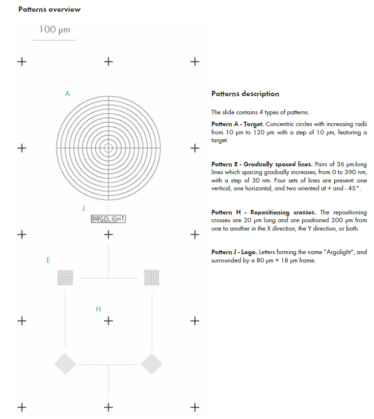 Argo-Check Resolution樣片主要包含 七個熒光顯微圖案,旨在確保成像系統的橫向分辨率。