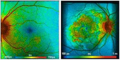 人眼眼底(背景)的壽命圖像。通過這種方式,有可能及早發現眼部疾病,因為這些疾病通常伴隨著眼底的代謝變化。反過來,這些引起內源性熒光團的熒光衰減參數的變化。